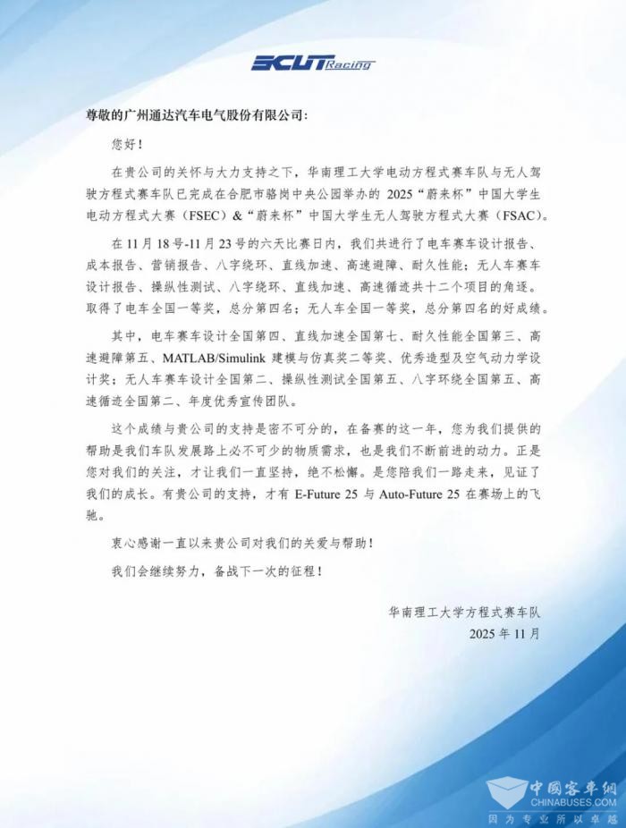 车队在信中的结语,也正是我们共同的心声。通达电气将继续与华南理工大学方程式赛车队并肩前行,在技术协同、人才培养、创新孵化等方面深化合作,助力更多年轻人勇敢追梦、实干创新。