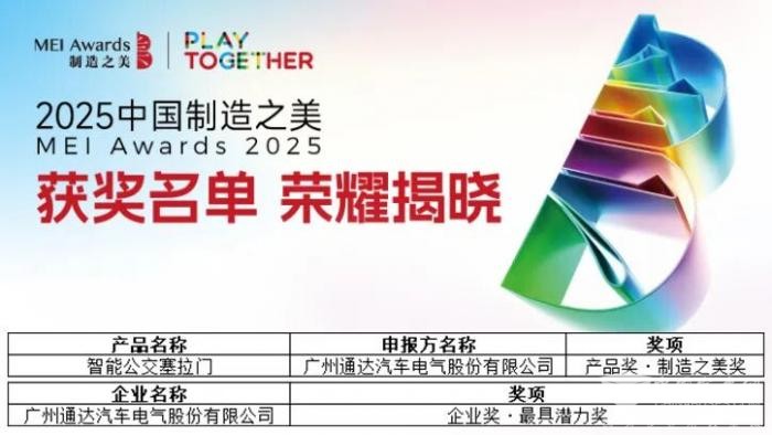 我们给出的答案是“系统化工业设计”——将机械工程、电子控制与造型美学无缝融合,打造出可靠、充满人文关怀的智能公交塞拉门。这一答案也获得了权威认可:在公布的2025中国制造之美的评选结果中,通达电气获评“最具潜力奖”,公司自主研发的智能公交塞拉门在8540件参赛作品中脱颖而出,荣获“制造之美奖”。