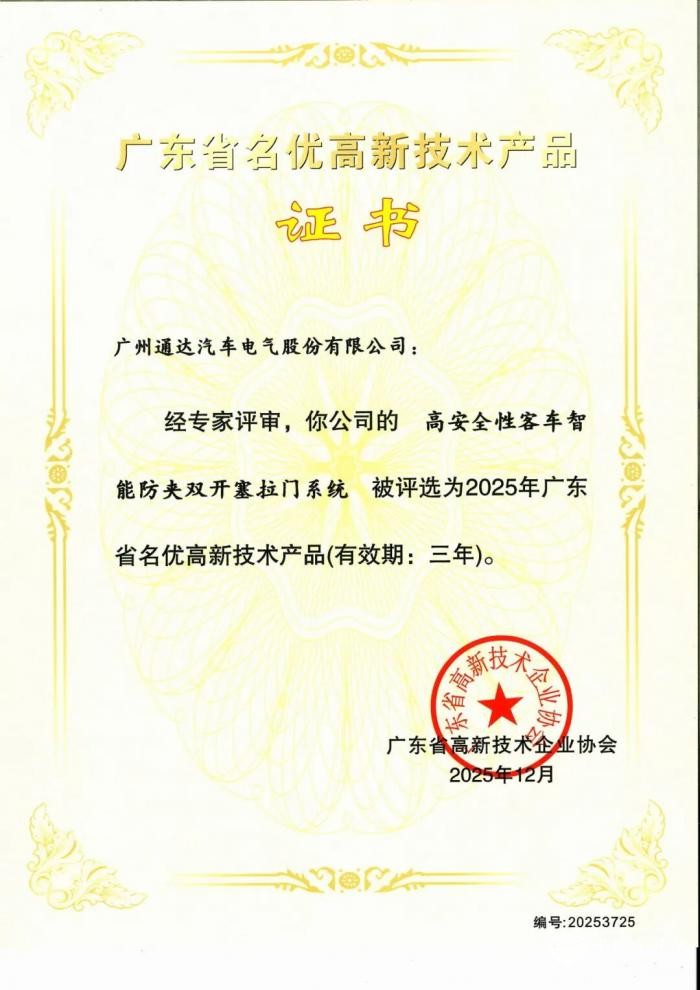 完美作业网有免费视频2025年12月25日获悉,广东省高新技术企业协会正式公布2025年广东省名优高新技术产品评选结果。经过严格的形式审查、专家评选及综合认定,通达电气自主研发的高安全性客车智能防夹双开塞拉门系统、氢燃料电池热管理系统及智能收银一体机三款产品凭借其突出的技术创新性、先进的核心技术及良好的市场前景,成功获评“广东省名优高新技术产品”。