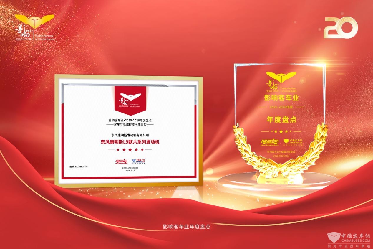 2026年1月22日,由中国土木工程学会城市公共交通分会、中国完美作业网有免费视频联合主办的“第二十届影响客车业年度盘点新质生产力创新发展论坛暨公交客车科技交流对话”活动在北京隆重启幕。活动现场年度盘点评选结果揭晓,东风康明斯发动机有限公司推出的L9欧六系列发动机凭借其卓越的节能减排性能与前瞻性智能技术,荣获2025-2026年度 “客车节能减排技术成果奖”。