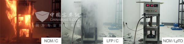 凭借对电池原料的技术改性,尤其是LpTO负极材料的应用,电池的安全性能得到了极大的提高。图2是几种目前常用在新能源汽车尤其是纯电动公交与混合动力公交的电池与LpTO电池在同等条件下的穿刺测试对比照片。电池均为10Ah软包装单体,在相同的测试条件下,采用三元材料(NCM)作为正极,石墨(C)做负极的电池出现起火现象;采用磷酸铁锂(LFP)作为正极,石墨(C)做负极的电池产生了浓密的烟雾;而使用LpTO技术的电池则无异常现象出现,同时电池电压亦显示正常。这是因为LpTO电池从基础上改进了现有其他体系的锂离子电池潜在的安全问题。
