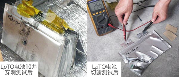 在某些更极端的测试条件下,LpTO电池也表现出较强的安全特性。图3分别展示了LpTO电池在经过并联穿刺试验,或多次切断后的实物照片。可以看到,电池在并联穿刺后并未发生起火或者爆炸,而经过多次切断试验后还能保持其电压。