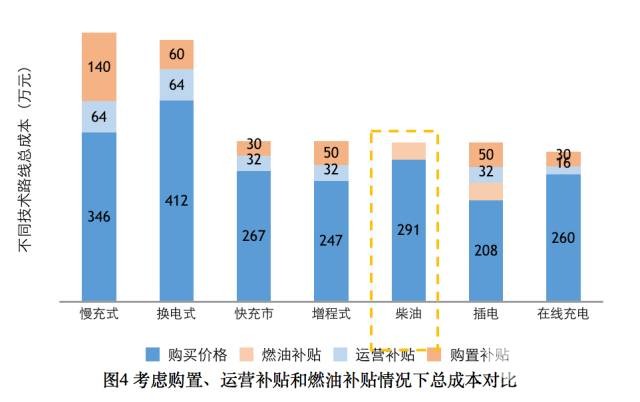 建议就以上分析来看,快充式、增程式、插电式和在线充电公交模式使用周期成本相对柴油公交已经具备经济优势。