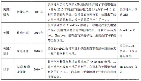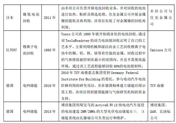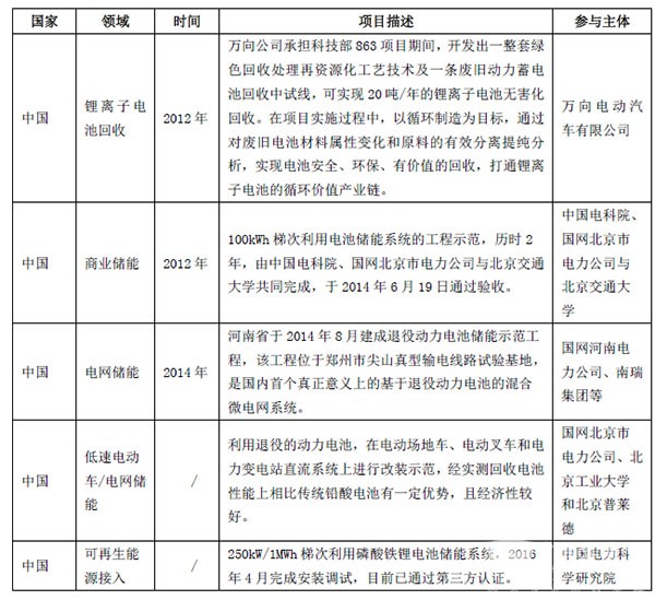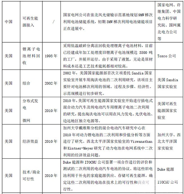 动力电池回收利用虽然已经引起政府部门、科研机构、部分企业的关注和研究,发展潜力巨大,但还没有大量的资源投入。美国、日本、欧洲和我国在退役电池的回收再利用方面进行了不同的尝试。表1为国内外典型的动力电池回收再利用示范项目,涉及到储能、移动电源、分布式发电、商业可行性研究及拆解、回收等多方面。