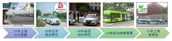 2008年北京奥运会23辆车,其中3辆大巴,20辆轿车。2009年有16辆车到美国加州进行了试验。2010年上海世博会,一共是196辆燃料电池车参加了运营。燃料电池功率是50kW,锂电池的功率是20kW,此外,还参加了新加坡的世青赛。北京奥运会用的公交车在北京801路上进行了示范运行,燃料电池的功率是80kW。