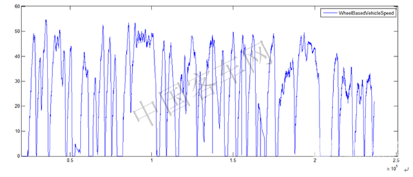 车速分布概况如图2,根据混合驱动最高限制车速,对发动机最大功率和最大转矩、电机最大功率和最大转矩、主减速比、变速器最大与最小速比和动力电池容量等相关参数进行优化选型,采用60Ah的电池,6档变速器,速比为6.39,3.97,2.4,1.48,1,0.73,发动机最大功率和最大转矩为155kW/710N·m,电机最大功率/最大扭矩为95 kW /850N·m。