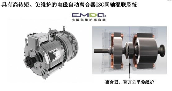 我们公司的战略就是持续推动技术进步,打造世界领先的新能源商用车电动系统。直驱电机的进步差不多了,我们最关键的是要突破离合器和少档位变速器的产品瓶颈,构建电机加传动的优势产品。变速器并不是档位越多越难做,在电动领域,实际上档位越少越难做,因为换挡的级差很大。举一个例子,首先在离合方面,精进电动的第一代ISG混联产品,在油耗、可靠性方面绝对是行业标杆,终端客户非常忠诚。我们在在2014年、2015年第一代系统里采用气动电控干式离合器。我们经过四年的研发,已经彻底淘汰了气动干式离合器,实现了电磁离合器,百万公里免维护,已经推广了上千套,甚至我们的客户前几批车直接开到拉萨去,翻过唐古拉山口(海拔五千多米)。这个离合器最根本的特点就是通过创新性的电磁设计,实现了在干式条件下,金属对金属的啮合,同时实现无缝的全同步的接合,没有磨损,这样就给客户带来了百万公里免维护的优点:一滴油不用加,一次箱子不用搭,一次离合器不用换,一只气缸都不会坏,给客户带来百万公里免维护的优势。这个技术同时我们的总成带来了总尺寸缩短,重量降低的好处。另外两个很重要的优点,首先当我们维护量少的时候,我们给客户节省了维护变速箱、离合器的费用,每年大概6000到10000元。同时,以往的干式离合器是不防水的,因为有通风、排尘各方面的要求;我们的新型离合器也做到了取消在动力总成里面所有的漏水点,使混动完全可以实现浸水运行。