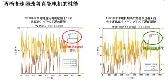 刚才我讲到直驱技术的局限,我们在这里看到的是一个典型的2800N·m的电机,在满足13%~15%的基本爬坡度要求,在12米客车上,如果要跑90km以上的续驶高速,即使在C-WTVC的工况下,很难实现工况的跟随,也就是在这个地方满足不了车速的要求。