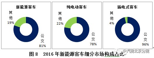 2016年,公交车在新能源客车细分市场的销量结构占比高达81%,成为新能源客车市场的核心市场。特别是在插电式客车领域,公交用途占比高达96%。