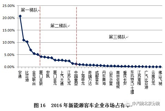 从图16可以看出,2016年,我国新能源客车共有42家企业实现销售,市场集中度较低,呈现“长尾状态”。各家企业市场份额基本可以分为三个梯队:市场份额大于5%:宇通、中通和比亚迪,南京金龙、金龙联合和北汽福田共5家企业。市场份额1-5%:厦门金旅、珠海广通、安凯客车等11家企业。市场份额小于1%:四川野马、上海申沃等25家企业。