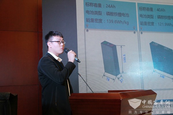下面三款电池是我们公司针对商用车系统推出的磷酸铁锂电池,有24AH、40AH、76AH,重点是76AH,它的能量密度到149W· h/Kg。