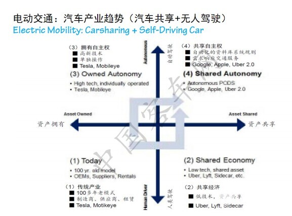 这里罗列了各种各样的出行的方式,出租汽车服务、共享汽车服务,共享出行服务,在中国也有一种小小的创新苗头,大家可能都不熟悉这些新兴的公司,这些公司都很小,将来成不成气侯,谁也不知道。