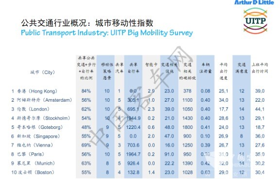 全世界做公共交通做得最好的城市,大家心里可有一个底,这张图表是国际公共交通联盟与一个咨询机构共同做了一个统计分析。我们看到全球移动性最好的城市是香港,公共交通移动性指数排在最高位置,什么叫做移动性指数?这张表罗列了大约十个因素,这些指标跟我们国内搞的公共交通都市稍微有一点点不一样。各位领导如果有兴趣,你会看到国际社会公认的什么指标叫做公共交通做得好,这个指标和我们考核的指标稍微也有一点不一样。公共交通、步行和自行车被列入最重要的共享出行方式,香港的这个指标排在最高的水平,香港为什么会名列世界前茅?根本的就是发展了高质量的公共交通服务。