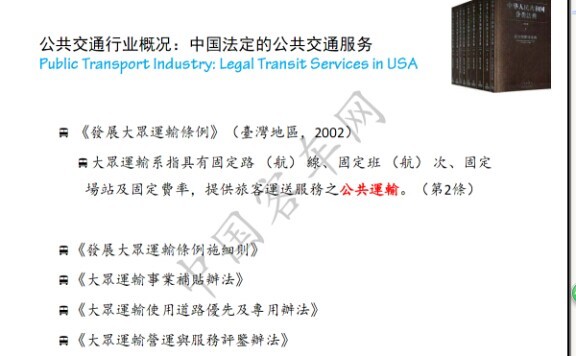 我们看看台湾的情况,台湾把公共交通叫大众运输,台湾也发布了一个法案叫《发展大众运输条例》,公共交通的定义是指具有固定路线,固定班次、固定场站、固定费用,提供旅客运送服务之公共运输,在这个法案的具体实施当中,又增加了两个辅助法案,一是实施细则,怎么推进大众运输的发展,大众运输事业要补贴,这就是我们讲到公共交通当中所具有社会性的部分,是需要政府补贴的,只是社会性服务那一部分需要补贴。所以在台湾的法案中,首先定位公共交通为服务,然后确定他具有的公益性,并用补贴的方式完善这种服务方式,同时,保证公共交通路权又有一个特别的法案,保障公共巴士优先通行,这两个措施确保公共交通服务的社会公益性。