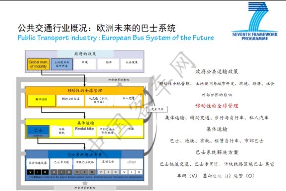 我们再来看看,欧洲要让公共巴士系统有吸引力,他们对未来的公共巴士系统做了一些研究,这是欧盟研究框架中的一个项目,简单地说,就是要让公共巴士系统有吸引力。他们做了哪些工作?在城市的生活中,从全球移动性管理,到包括集体运输和个人交通的各种交通方式,进而在公共巴士系统中,既有传统的定点、定线的巴士,还有高质量的巴士快速交通服务,以及微型公共交通服务,都可以解决人们的出行问题,最后都落脚在车辆、基础设施再加上运行三个方面,我们在这些方面做好工作,通过车辆的技术创新、道路基础设施的创新,和运用管理信息的创新,全面提高公共巴士系统的吸引力。