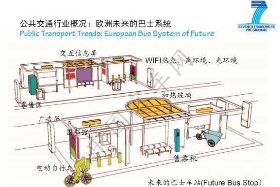 我们说公共巴士频繁上下乘客,需要它具有良好的流通性,无障碍的流通性,这从车辆设计上来讲,宽大的车门、残疾人的座椅通道,这些是有技术规范要求的,车门的设计布置,欧洲做了一些示范运营。这里可以看到奔驰公司在巴士上做了一些小措施,帮助大家手机充电、提供wifi上网,还可以看到些动态的信息,在巴士车站上也可以看到车辆运营位置等相关信息。