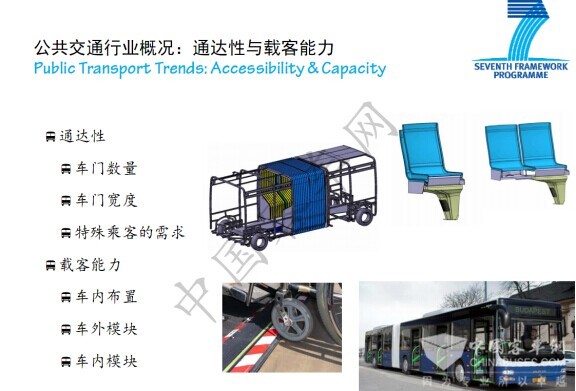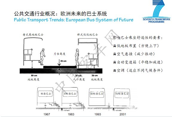 说到公共交通的运营有很多要求,首先取决于政府的政策,从车辆的角度来讲,保证驾驶员的操控性,以及保证乘客的舒适,欧洲人做了很多的研究工作,大家已经看到,低地板巴士不单纯是车辆技术的进步,更重要法律上保证行动不便的人,除残疾人之外,老人、推婴儿车的人,都可以方便地利用公共交通。从1967年欧洲制定标准巴士技术规范,地板是两级踏步高;到1993年的时候,欧洲已要求所有的巴士是低地板结构,这也是美国残疾人法案带来的影响,包括中国政府也制定了残疾人保护条例,提出了类似要求,只是不像美国规定这么严格和明确,所以我们的公共交通行业在这个方面还有很大的空间来改善,这是我们从这个角度看到的。