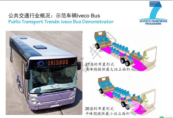 这个车型你看到驾驶员的位置从原来的边上放到了中央,将来的司机责任就是开车,他不再负责检查乘客上车付费,因此,在保证车辆的行驶安全情况来讲,这样设计是很重要的,如果将来有恐怖袭击,也不容易袭击到司机,它跟轨道车辆一样的。在车辆方面,欧洲依靠提高车辆性能来提高巴士系统的性能,还有两个方面,我们可以讨论道路基础设施和运营管理方面,通过这样的研究分析,让公共巴士系统更有吸引力,人们才有可能放弃私人小汽车来坐公共巴士,这是欧洲正在做的发展趋势。
