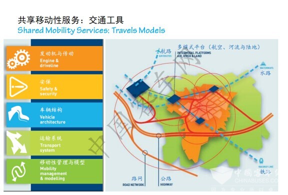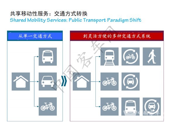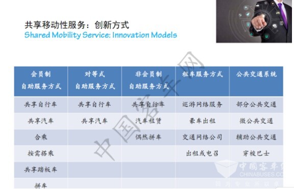 因此,我们说共享移动式的服务,不是单一的公共巴士跟所谓的共享单车联合在一起,我出门口这个地方可以有共享汽车,自行车,把共享汽车骑到公共巴士站,换乘地铁长距离出行,这样来讲,交通方式一体化,共享移动性服务就可以解决所有出行问题。