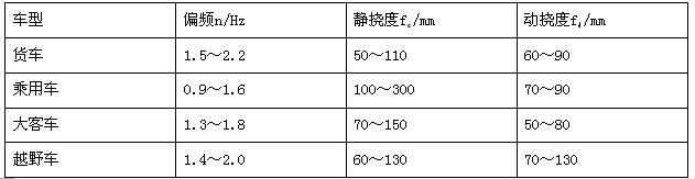 在做悬架设计时,我们首先根据车辆的用途和平顺性要求确定前后悬架的偏频,再根据公式计算前后悬架的静挠度和动挠度。参见表1。