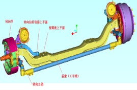 1.首先在Pro/E操作环境中,打开整车总布置骨架模型,参照如图4(a)所示的车桥(以前转向桥为例),将四轮定位参数(主销后倾角、主销内倾角、车轮外倾角、及前束),车桥上安装关联构件处相联的特征位置(如板簧中心距、主销中心距、落差及板簧座上平面、转向拉杆铰链上平面)构建出具体的三维总布置骨架模型如图(4b)所示。因车桥结构元素相同,上述参数的数值因不同的车型要求选择可以不同,因此在具体的车型总布置中可根据不同的车桥参数可实施具体的调整。