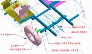 5.转向车轮及纵向直拉杆布置校核,在总体骨架模型中,按步骤1已建好了车桥上安装关联构件处相联的特征位置,现以转向节轴线作为旋转轴,依据车桥内外转角及拉杆铰链上平面位置进行左右旋转,从而找出了其对应轮胎、转向拉杆铰链上平面的极限处位置,从而对车轮,转向直拉杆进行运动校核并检验是否有干涉等如图8所示。至此车辆三维悬架布置设计完成,各参数关系均已确认并通过Top-down design 将具体的参数值发布给部件设计人员进行具体的结构设计。