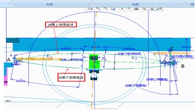 4.上下跳动极限位置校核,依据已确认的钢板弹簧座耳A、C点及吊耳前后摆动圆弧,按照上述步骤2的建模方法及关系式建立起板簧动载上跳动极限弧线、下跳动极限弧线如图7所示。此二条弧线定出悬架上下跳动量,动载上跳动极限曲线中间点(本处是缓冲块压缩了1/3处)确认出缓冲块位置,从而确认校核缓冲快位置和伸缩量。减振器上联结点同车架联结,其下联结点与车轿联结,并同车桥一样随板簧上下一起同步跳动,因此可根据板簧上下二条弧线定的跳动量来确认及校核减振器伸缩行程是否合适,验证板簧满载状态、上下跳动极限状态时对应的板簧吊耳角度布置取值是否合理。吊耳摆角尽量避免负值的前提下,摆角越小越好,空载时摆角10-15°为宜,满载时摆角14-30°为宜。如果角度不理想,修改上述步骤3中满载时的吊耳摆角或者吊耳长度;同样的方法在后悬架布置中,后悬架与后桥传动轴联结端面与板簧一起随车载荷上下一起跳动,因此也能确认及校核传动轴伸缩范围及万向节的夹角是否合适。
