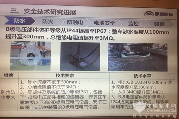 第二个是安全事故方面。国家工信部统计从2009年截止到2016年底,我国新能源汽车安全事故总共有31例,其中去年有17起,客车有13起,今年上半年有8起,客车是4起,事故率明显提高,尤其是电动客车截止到2015年底事故率达到千分之0.17,针对这些安全事故的分析,宇通客车从新能源客车研发制造、运输、存储到充电运营维护、报废处置全生命周期的五个阶段着手开展了防水、防火、防触电、电池安全、监控、碰撞安全等六个方面的技术研发工作,提高了整个电动客车的安全标准。在防水方面,防护等级从IP44提高到IP67,新的电动客车安全技术条件也相对原来的标准有所提高。整车与全统车厢比电动客车存在存放时间长,因暴雨等恶劣天气会造成漏电等安全风险,因此在最新的标准里边制定了电动客车泡水实验。电动客车要在水里泡24个小时后仍可正常上电,同时没有起火爆炸的风险。在防火方面,主要是提升类似材料的阻燃性能,可充电储能系统的火灾自动报警功能,同时在标准里面要求至少要有火灾的自动报警功能。乘客舱实现了空间和热量的完全隔离,即使在电池发生起火的情况下,也不会危急到乘客舱,此外,设置手自一体化的逃生窗,在紧急的情况下可以快速疏散乘客。在防触电方面,就是重点研究了应用高压防护检测漏电保护高压等技术,建立宇通电动客车的安全标准。防触电方面重点就是绝缘电阻要实时报警,声光报警灯提示驾驶员,同时高压电路会自动断开。在电池安全方面,电池安全从材料结构一致性三个维度进行了锂离子电池的安全选型。通过对多个厂家电池解剖分析对标学习了解影响电池的安全影响因素。在电池方面,从首先在材料方面选择更加安全的电池材料,在单体和模组方面按照国家标准进行针刺挤压加热等安全性能的测试,确保不起火不爆炸。并且对电池的箱体高压线处接插件均采用阻燃材料,达到国家标准最高等级。电池箱体按照国家标准进行火烧的实验,未发生自动自主蔓延燃烧的现象。在电池集成方面,宇通针对电动客车市场需求,基于模块化的设计方法开发了两种高安全高可靠的标准电池箱并进行验证,满足震动火烧碰撞等极端条件下的安全标准要求,新标准进一步提高要求,针对振动实验后电池系统仍要达到ip67的要求。在监控系统方面,宇通新能源远程监控通过对车辆的地理位置零部件运行工况等信息的监控,实现故障预警检测温度检测能耗分析远程程序的更新等。对于宇通现在已经推广的现在市场上已经有6万多辆新能源客车实现了远程的监控。在碰撞安全方面,电动客车其实包括整个客车行业,原来没有相关的碰撞的标准,后来宇通在碰撞的技术方面碰撞的标准方面都做了很多工作,首先是整车控制器可以实现碰撞后的高压断电,远程预警等技术建立了客车的结构安全的标准。另外一个就是对高压部件的布置在整车上有有相关的要求,动力电池不允许布置在车辆前部400毫米以内,车辆后部的200毫米以内,要求电池箱安装舱体增加防撞梁,加强对电池系统的防护。这是对碰撞的标准的研究。