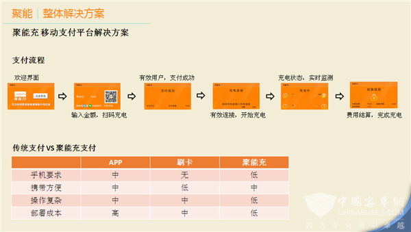 支付的流程方面,在欢迎界面有我们的LOGO,然后输入支付金额,扫二维码,无需打开APP扫码,也不用关注任何微信公众号就可以扫二维码,当然也可以关注,但也可以不用,这个扫码是我要向你支付一笔钱时,直接在微信右上角点扫码就可以支付了,支付以后就是有效连接,最后完成一个结算,在这两天有很多同行或客户问到很多问题,第一个问题,为什么先付费再充电,从聚能角度来讲还是保护拥有人或运营商、物业管理公司,我们想保护这一方的利益而避免产生充了电不给钱就走,如果一定要提高客户体验或者从您的角度来讲,先充电再付钱,我们可能枪座做一个限制,必须付完钱再走。类似于微信红包,我跟你发红包,你不收,24小时不收,24小时之后就会返还,同样我充20元,只用16元,4元会返还。APP能刷卡和解决方案的对比,我们也有刷卡,也有APP,我们并不否认这两种方式,只是在某些情景下,轻运营商或行业外客户,我们这种方式应该是业界领先和合理的方案。最后我们并不是从无到有的公司,在短短时间之内我们也做了各种各样的案例,包括公交场站、度假村、地产商、园区等。