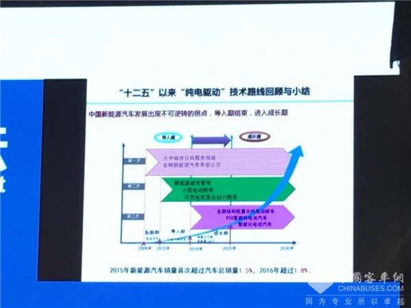 我们“十二五”以来,中国新能源汽车市场经历了一个快速的增长过程,2011年—2016年五年间,从不足5000辆发展到51万辆,保有量从1万辆提升到100万辆,5年产量、销量都是100倍,也是占全球的一半,处于遥遥领先的地位。应该说我们在今天来看中国新能源汽车产业的话,这个发展是出现了不可逆转的拐点,我们导入期可以说基本结束,现在进入成长期了。我们经历了从奥运示范开始的酝酿期和从2010年开始的“十城千辆”示范的导入期,现在我们认为已经进入了成长期,因为我们新能源汽车的销量已经超过汽车总销量的1.5%,2016年超过1.8%,今年我们预计还会继续成长,从去年的51万辆我们估计还应该在70万辆左右。这是我们现在发展的时期,导入期是政府扶上马的,我想成长期政府还要送一程。