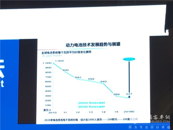 我们下一步的趋势是什么呢?全球电池系统每千瓦时平均价格,在2020年大约在1000元人民币、100美元和100欧元之间,就是说我们现在的目标1000元人民币,在全球不算低,实际上是高的,我们理想的价格是100美元,在2020年国外有可能做到100欧元,我们以前的目标是1000人民币,实际我们比他们要高的,这是我们下一步要努力的。