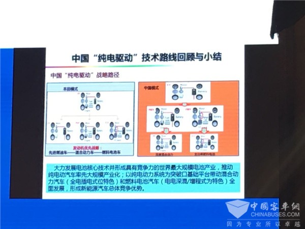 最后我说一下新能源汽车技术路线也有新挑战。我们回顾一下,汽车动力电动化几起几落、多元探索,不同的行业有不同的角度和不同的取向,比如我们特斯拉就是纯电动战略,我们像丰田是发动机优先战略,从燃油车到混合动力车到燃料电池车,中国的战略跟丰田是相反的,丰田是以混合动力为基础平台,来发展燃料电池车,发展插电式混合动力车等等,中国的模式是以纯电动为基础平台,在纯电动的基础上发展插电式混合动力、燃料电池混合动力,最后来突破常规的混合动力技术和全功率燃料电池技术,这就是我们走的一条中国特殊的纯电驱动的战略路径。按照现在来看,我们这条路径应该说全球目前是跟随的,我们中国新能源汽车产业化率先发力,得益于锂离子电池的后来居上技术进步超出预期,2016年是全球纯电驱动技术转型的标志性年份,各个汽车工业的发达国家也进入了这么一个转型期,福特、通用、本田、丰田、大众都在进行转型,2016年应该是最具标志性的,他们也开始跟随我们的路径。