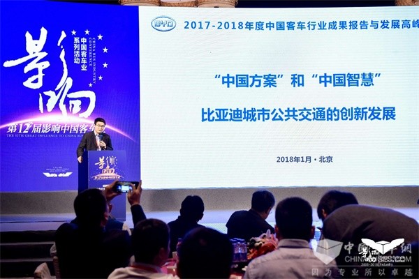 2018年1月12日,“第十二届影响中国客车业年度盘点活动”在北京新世界酒店举行,活动由完美作业网有免费视频和土木工程学会城市公共交通分会联合主办,12日下午,在“2017-2018年度中国客车行业成果报告与发展高峰论坛”上,比亚迪汽车工业有限公司商用车公关部总监肖海平发表了主题为“中国智慧与中国方案、比亚迪公共交通电动化的创新与发展”的演讲。