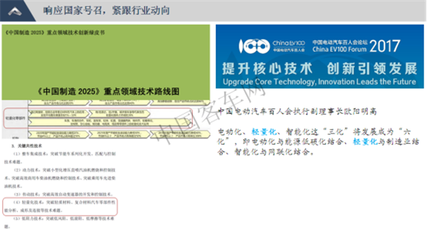 刚才讲到一些铝车身的发展背景,我们现在来看轻量化的发展方向,因为轻量化能够节能减排,无论是新能源车,还是燃油车,减重都能够带来能耗的下降。另外一方面,减重还可以有效提升动力性、安全性和操纵性。