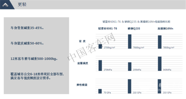 “更美观”,因为铝车身防腐的特性,可以保证全生命周期不用中修和大修。其实铝车身的耐腐蚀性,在沿海地区和高寒地区特别明显,因为沿海地区空气湿度比较大,盐份比较高,传统的钢车腐蚀会比较严重。前段时间我们回访客户,他们供给海口的机场摆渡车,开始是钢制的,后来替换成我们的铝车身,用了两三年以后,现在海口的用户说钢制的摆渡车不会再买了,因为铝车身确实防腐性能很好。为什么高寒地区效果也明显,因为铝合金的特性决定的,钢材在低温的情况下物理特性是下降的,铝合金特性刚好相反,温度越低,铝合金的性能反而越好,这是一方面;第二方面在高寒地区路面积雪比较多,融雪盐卷到车底对车身腐蚀是非常严重的,而铝车身对这一部分防腐性能也是非常好的。