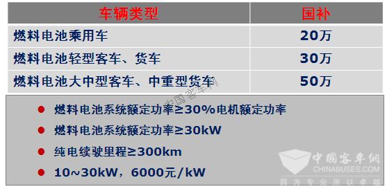 具体要求为:燃料电池系统的额定功率不低于驱动电机额定功率的30%,且不小于30kW。燃料电池系统额定功率大于10kW 但小于30kW 的燃料电池乘用车,按燃料电池系统额定功率6000 元/kW 给予补贴。燃料电池汽车纯电续驶里程不低于300 公里。此前文件中对续驶里程的要求从150 公里到200 公里不等。(编者注:该政策对燃料汽车的性能考核已经开始倾斜)