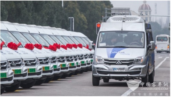 同一天,签约仪式现场,上汽大通氢燃料电池轻型客车20台交付上海化学工业区,承担通勤职责,后续80台陆续交付,按照上汽大通规划,预计2018年可实现累计交付400台。