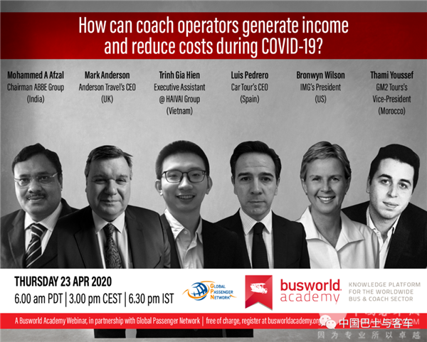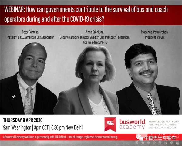 世界客车研究院(Busworld Academy)组织的网络研讨会:疫情后如何恢复巴士运营(How to Restart Bus Operations After a Lockdown),将于2020年4月30日北京时间晚上9 (美国东部时间早上6点、欧洲中部时间下午3点、印度标准时间下午6点半)在线举行,本次网络研讨会将邀请中国济南公共交通集团副总经理李峰、比利时布鲁塞尔市政府的交通部长Elke Van den Brandt女士、印度巴士与汽车运营商联盟主席Prasanna Patwardhan和美国纽约大都市交通局首席运营官Mario Péloquin一起,分享他们的经验和见解,并为您解答问题;世界客车研究院主管Jan Deman先生主持网络研讨会。