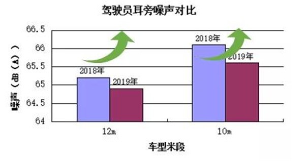 在舒适性方面,最难改善的NVH性能,各车型也改善明显,12 m段车型驾驶员耳旁噪声平均成绩提高近0.5%,后桥上方噪声平均成绩提高近2.5%;11 m段车型驾驶员耳旁噪声平均成绩提高近0.8%,后桥上方噪声平均成绩提高近2.1%,如图所示。