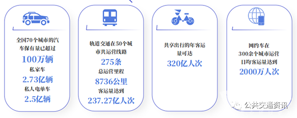 私家车、电单车、轨道交通、共享单车和网约车等多种出行方式不断分流城市公交客流量。据统计,截至2022年底,全国70个城市的汽车保有量已超过100万辆,私家车2.73亿辆,私人电单车2.5亿辆;轨道交通(地铁)在50个城市共运营线路275条,总运营里程8736公里,客运量达到237.27亿人次;共享出行的年客运量可达320亿人次;网约车在300余个城市运营,日均客运量达到2000万人次。