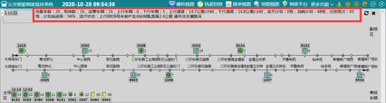 公交运行状态监测是基于智能调度平台的数据,利用可视化界面,实时掌握公交线网运行各类运营指标的情况。能够针对发车班次、运行速度、准点率、拥挤度等指标进行监测。