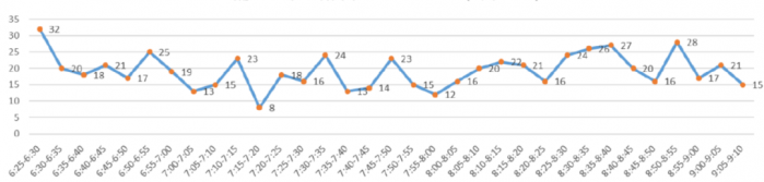 以上为理论公式,在实际中可利用GPS到离站数据统计站台平均停靠时间t。本文利用济南公交GPS到离站数据,根据数据中到站时间、离站时间标记,选取高峰期间经十路、经七路、和平路、文化东路、东荷路、舜义路等道路上公交站台停靠车辆的GPS数据,计算站台平均停靠时间t。经统计(图3),高峰期间主干道公交站台车辆平均停靠时间为48s,次干道公交站台车辆平均停靠时间为45s,支路公交站台车辆平均停靠时间为25s,可以作为新规划道路公交站台泊位计算的参考值。