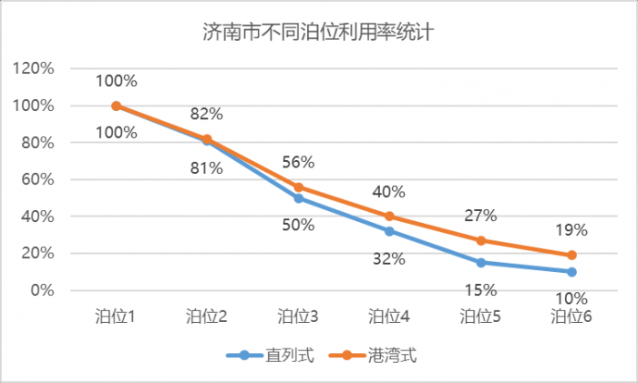 (1)建议单组站台的设计泊位数不宜超过3个。根据对济南市站台泊位的利用率分析,3个以上泊位的利用率不高,从第4个泊位开始,泊位通行能力下降至50%以下。