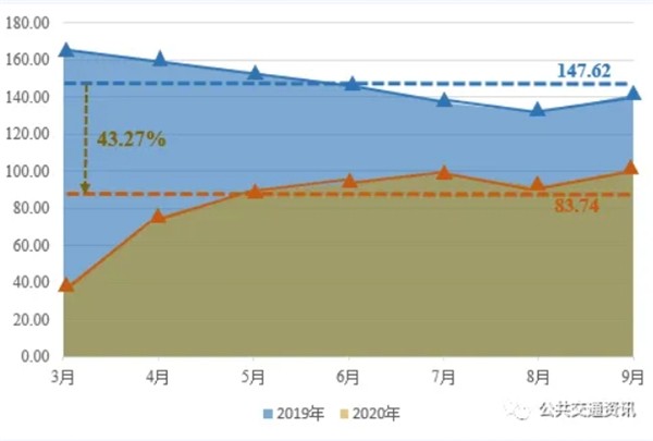 图1、2019年及2020年3至9月公交日均客运量趋势对比图