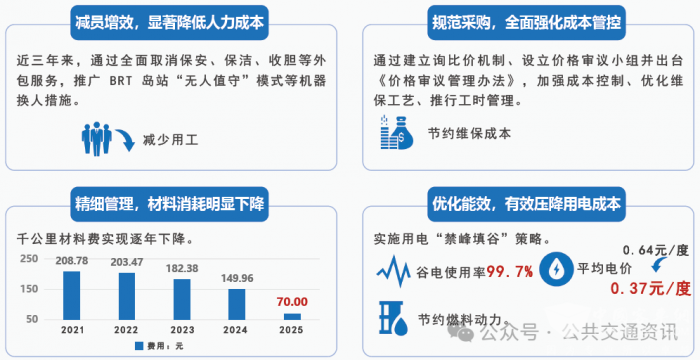 一是优化人员配置。通过全面取消收胆、保洁、保安等外包服务,并推广BRT岛站“无人值守”与“机器换人”模式,有效减少人工投入。