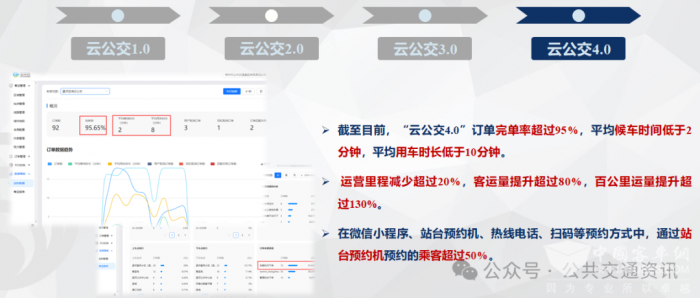 截至目前,“云公交4.0”订单完单率超过95%,平均候车时间低于2分钟,平均用车时长低于10分钟;运营里程减少超过20%,客运量提升超过80%,百公里运量提升超过130%。