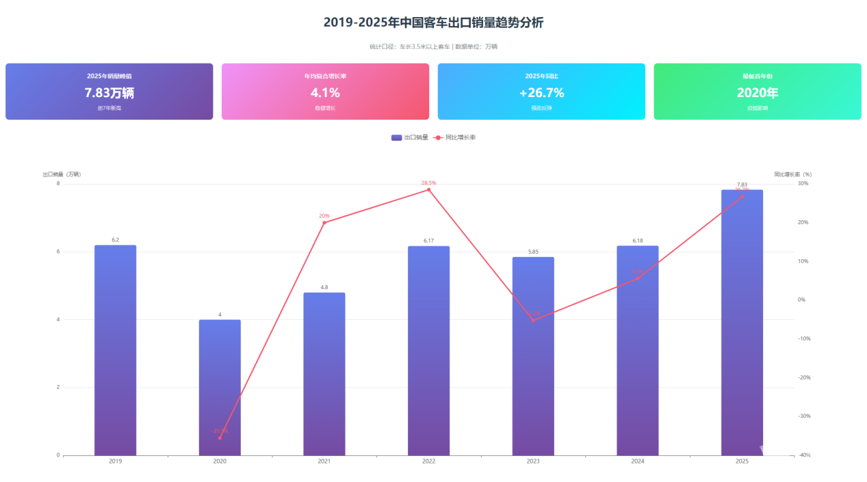 我们整理了2019-2025年中国客车出口销量对比数据:2020年受全球大环境影响,出口量大幅下滑35.5%;2021-2022年快速复苏,同比增长率分别达20.0%和28.5%;2023年略有回调,2024-2025年重回高速增长通道,2025年以7.83万辆创历史新高,同比增长26.7%。