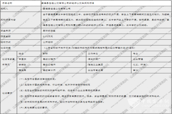 襄垣县世通公交有限公司拟对襄垣县世通公交有限公司新能源公交车采购需求论证进行政府采购,根据《山西省财政厅关于印发<加强政府政府采购需求确定和履约验收管理办法>的通知》文件要求,我单位委托代理机构于2019年3月7 日组织专家对该项目采需求进行了论证,并根据专家意见修改完善采购内容,现将有关情况公示如下: