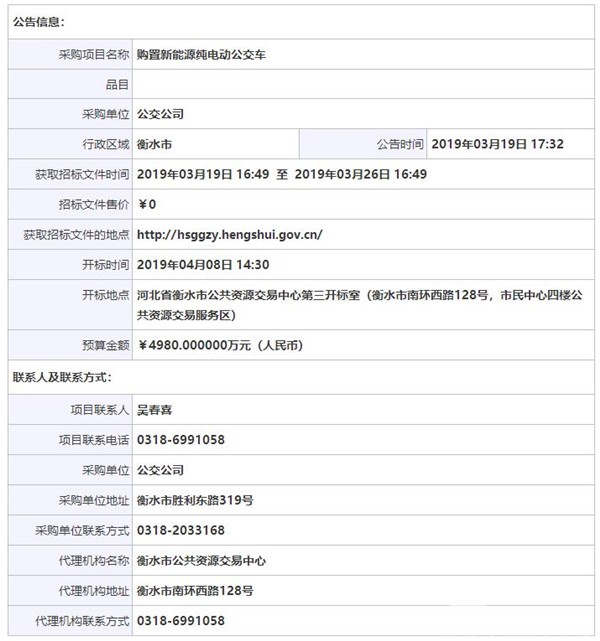衡水市公共交通总公司8米级纯电动新能源公交车采购项目公开招标采购公告具体信息如下: