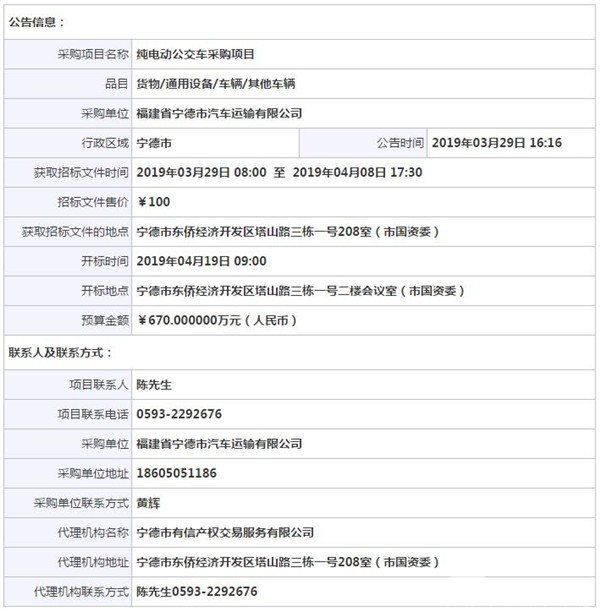福建宁德汽车运输有限公司纯电动公交车采购项目招标公告